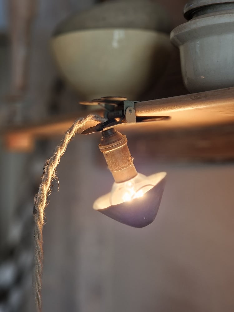 Petite lampe champignon ancienne en métal avec sa pince et son capuchon qui se clipse sur l'ampoule.