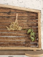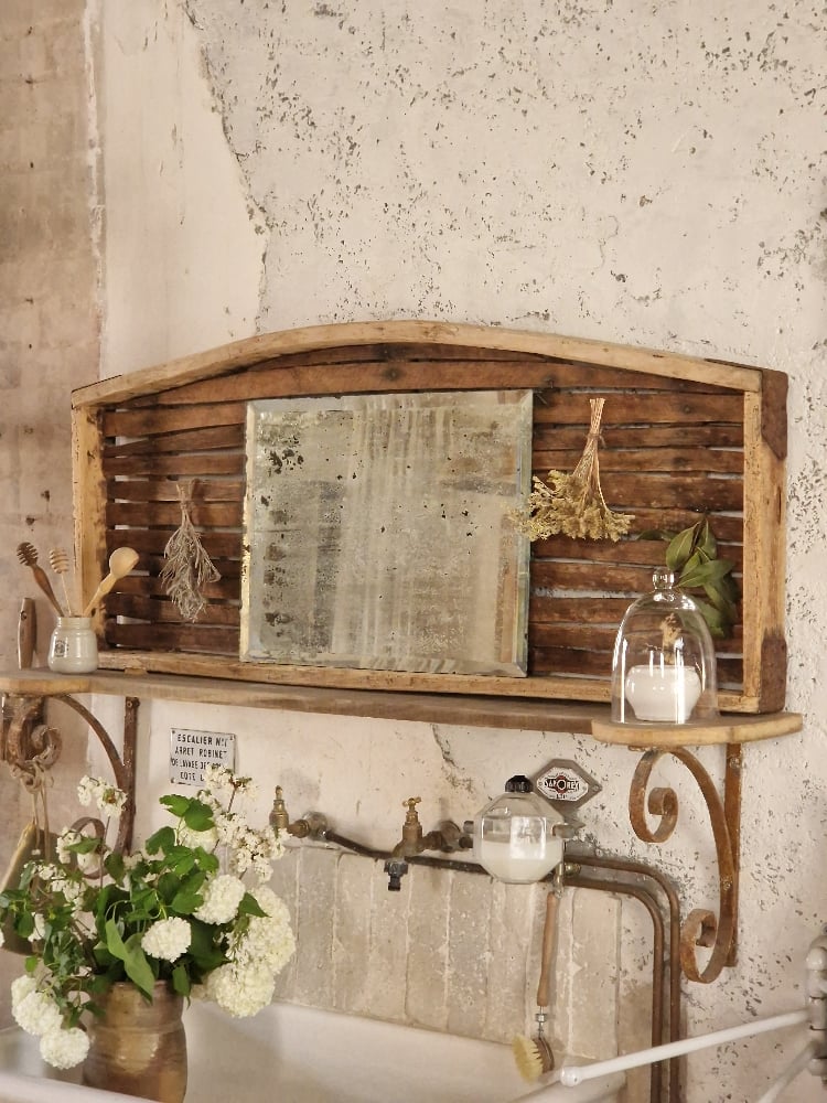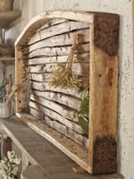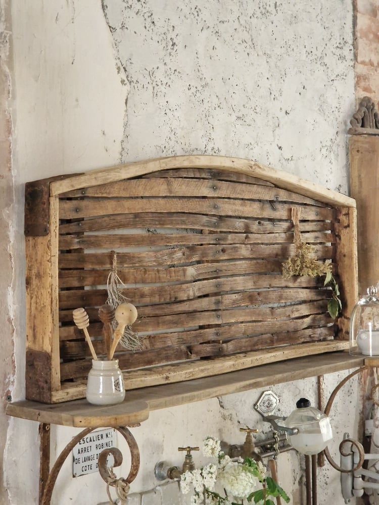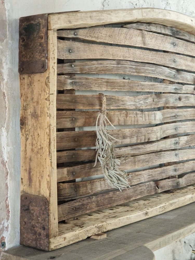 Ancienne clayette de ferme en bois détournée en panneau mural, avec ses lattes irrégulières, sa courbe douce et sa patine naturelle.
