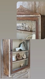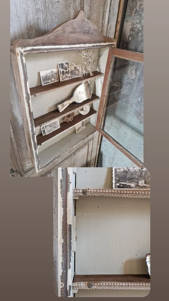 Sa vitre d'origine en verre bullé, sa corniche arrondie, les jolis galons en dentelle sur le rebord des étagères et sa patine font toute sa prestance et sa rareté.