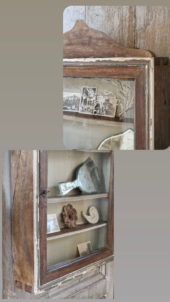 Sublime vitrine très ancienne en bois et stuc, fin XIX ème au format étroit, idéale pour exposer des petits objets