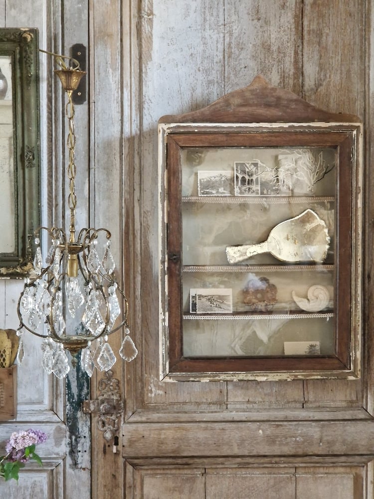 L'intérieur a été repeint en blanc crème antique qui illumine les objets à exposer, rappelle ses galons, la patine et les manques sur son encadrement en stuc