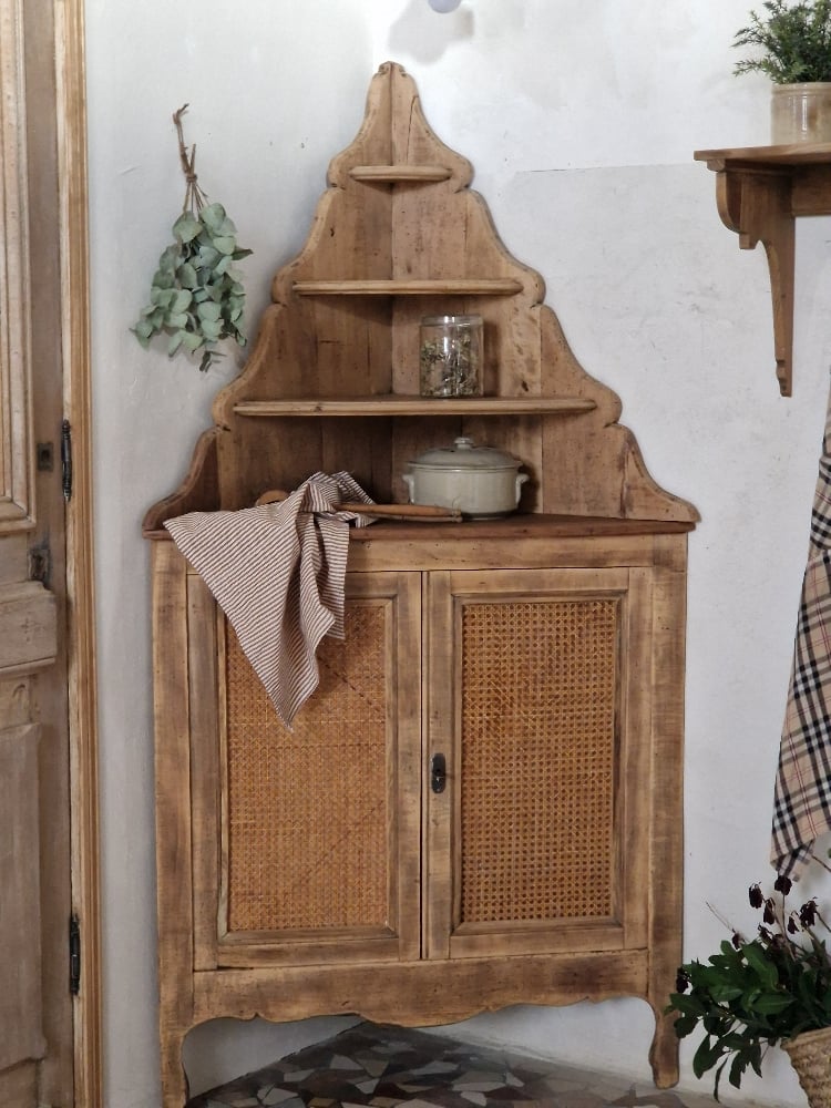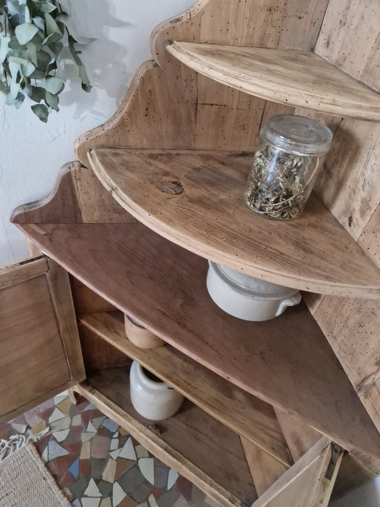 Pièce unique, ancienne encoignure de charme en pin, devenue rare, datant de la fin du XIXe siècle, entièrement revisitée dans mon atelier.